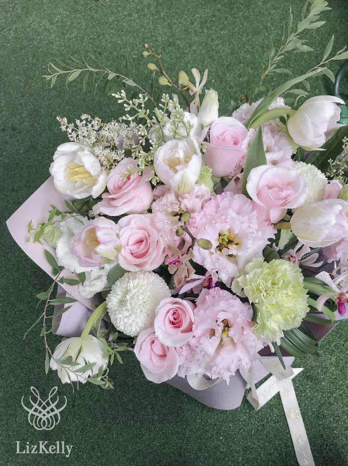 商品花材:粉玫瑰、鬱金香、結埂 、乒乓菊、雪柳 總尺寸:約25cm(W)x30cm(H) 鮮花鑑賞期限約3-5天,但花材也會因環境、氣候、溫度等因素而影響其保存天數。