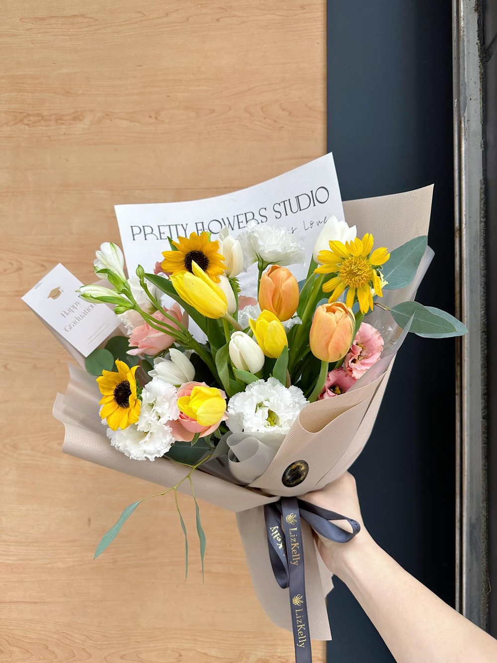 商品花材:向日葵、鬱金香、水仙百合、庭園玫瑰、桔梗、尤加利葉 總尺寸:約25-30cm(W)x35cm(H) 鮮花鑑賞期限約3-5天,但花材也會因環境、氣候、溫度等因素而影響其保存天數。 ※ 花市偶有臨時性的花材缺貨或品質不佳的情形,請同意讓我們花藝師以新鮮花材為您做專業設計調整。