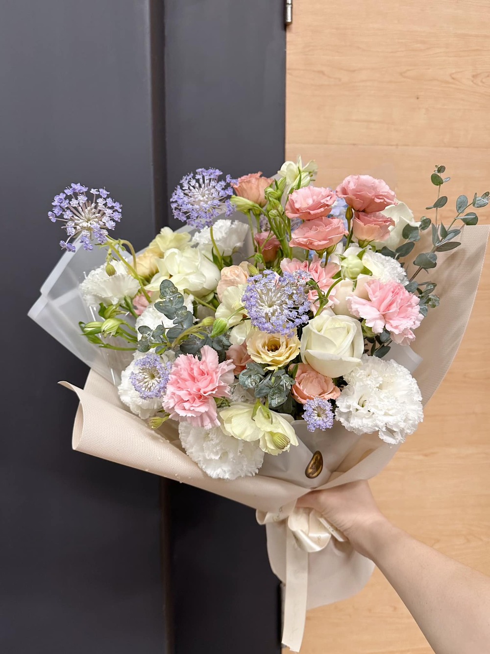 商品花材:紫翠珠、白玫瑰、水仙百合、小夏桔梗、康乃馨、尤加利葉 總尺寸:約30-35cm(W)x35cm(H) 鮮花鑑賞期限約3-5天,但花材也會因環境、氣候、溫度等因素而影響其保存天數。 ※ 花市偶有臨時性的花材缺貨或品質不佳的情形,請同意讓我們花藝師以新鮮花材為您做專業設計調整。