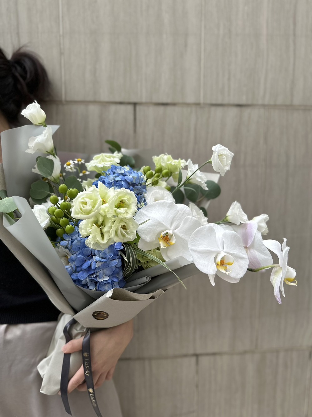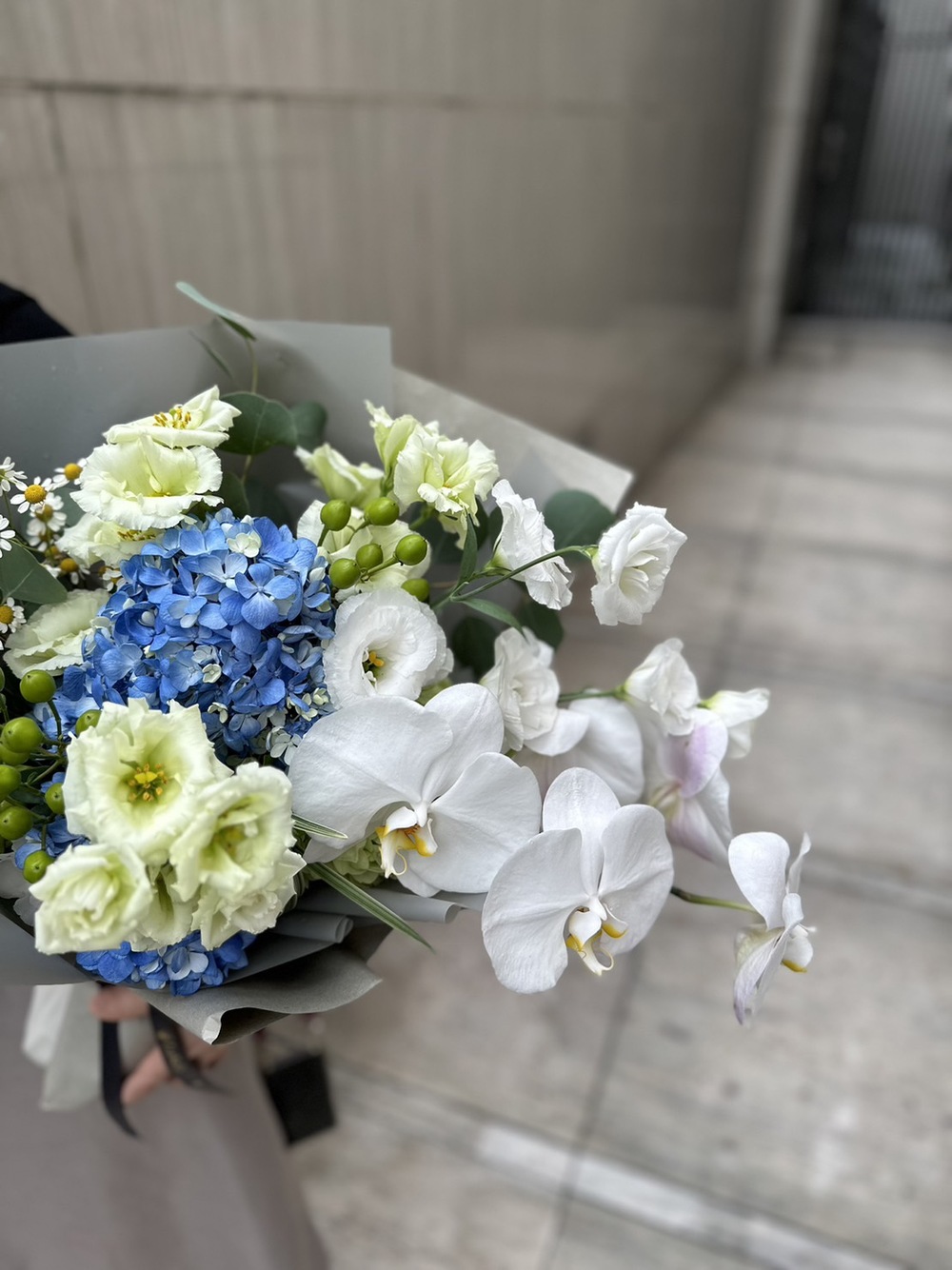 商品花材:蝴蝶蘭、進口繡球、綠蘋果、桔梗、洋甘菊、斑春蘭葉、圓葉尤加利 總尺寸:約30-35cm(W)x35cm(H) 鮮花鑑賞期限約3-5天,但花材也會因環境、氣候、溫度等因素而影響其保存天數。 ※ 花市偶有臨時性的花材缺貨或品質不佳的情形,請同意讓我們花藝師以新鮮花材為您做專業設計調整。