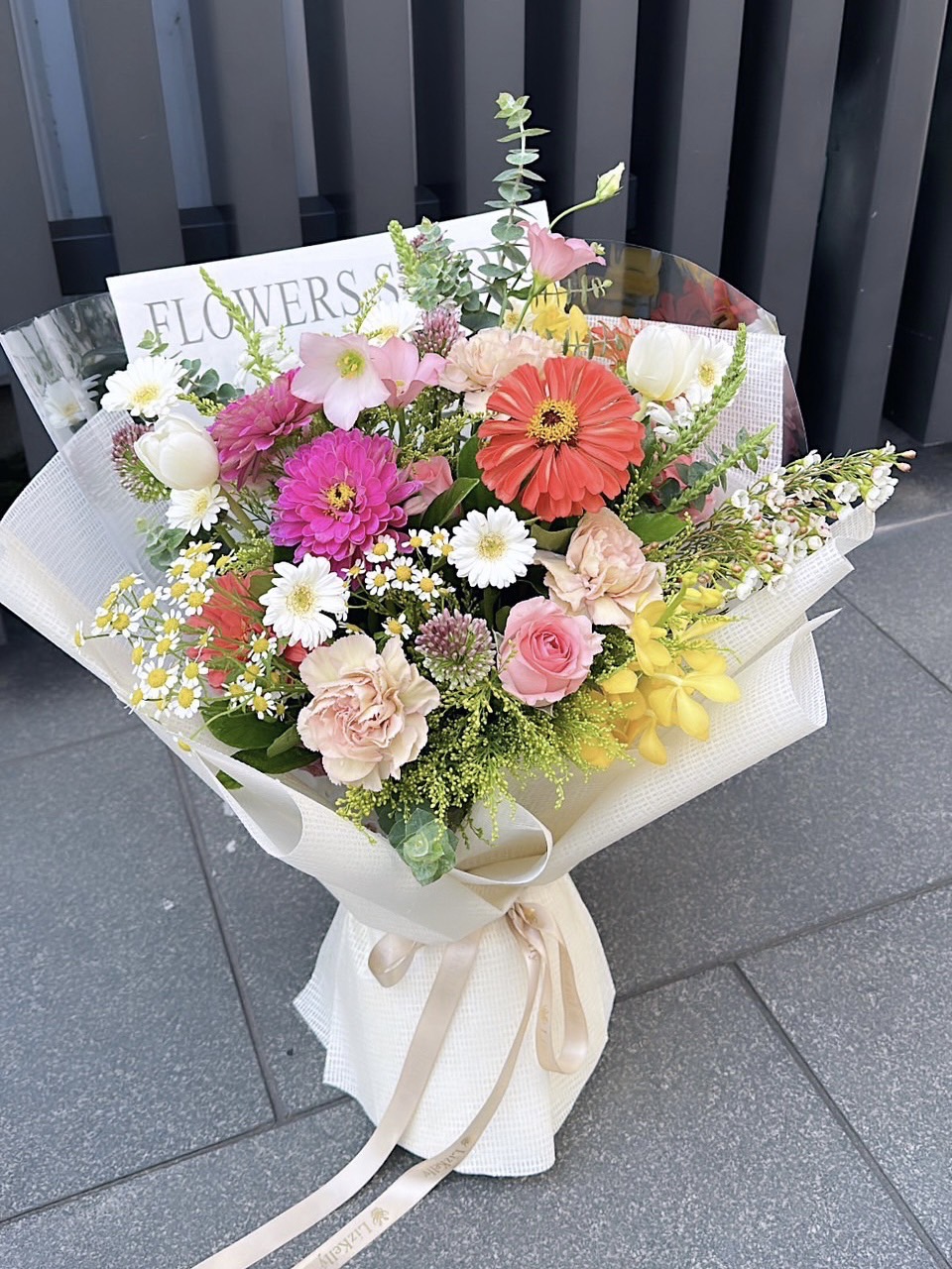 商品花材:百日草、鬱金香、粉玫瑰、餅乾菊、康乃馨、單瓣桔梗、千代蘭、洋甘菊、進口曲蔥、虎尾花、蠟梅、麒麟草、尤佳利葉 總尺寸:約30-35cm(W)x35cm(H) 鮮花鑑賞期限約3-5天,但花材也會因環境、氣候、溫度等因素而影響其保存天數。 ※ 花市偶有臨時性的花材缺貨或品質不佳的情形,請同意讓我們花藝師以新鮮花材為您做專業設計調整。