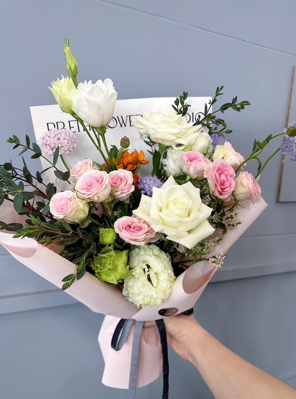 商品花材:粉玫瑰、進口白玫瑰、翠珠、雪梅、桔梗、尖葉尤加利 總尺寸:約30-35cm(W)x35cm(H) 鮮花鑑賞期限約3-5天,但花材也會因環境、氣候、溫度等因素而影響其保存天數。 ※ 花市偶有臨時性的花材缺貨或品質不佳的情形,請同意讓我們花藝師以新鮮花材為您做專業設計調整。