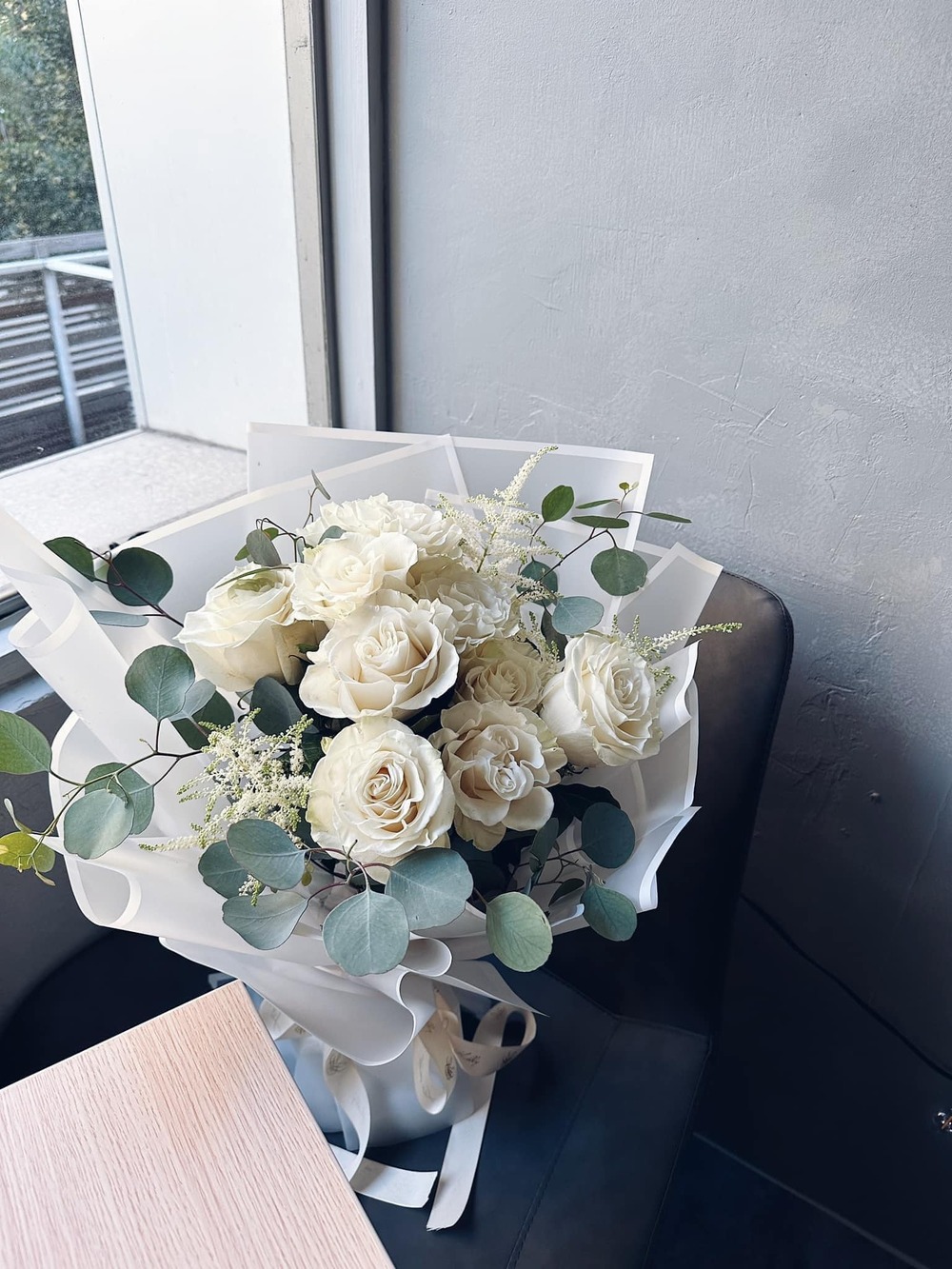 商品花材:進口玫瑰、泡盛花、圓葉尤加利 總尺寸:約30-35cm(W)x35cm(H) 鮮花鑑賞期限約3-5天,但花材也會因環境、氣候、溫度等因素而影響其保存天數。 ※ 花市偶有臨時性的花材缺貨或品質不佳的情形,請同意讓我們花藝師以新鮮花材為您做專業設計調整。